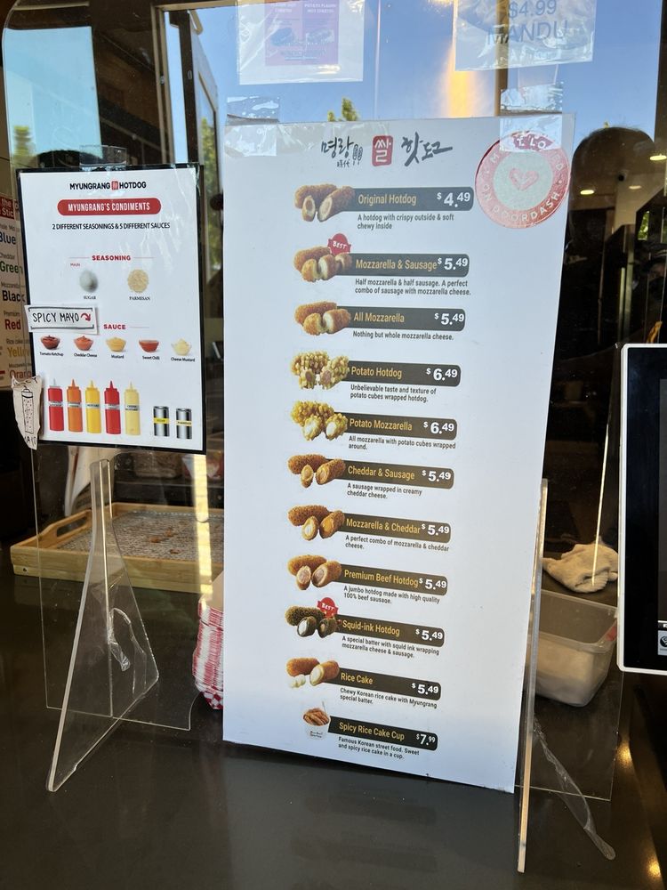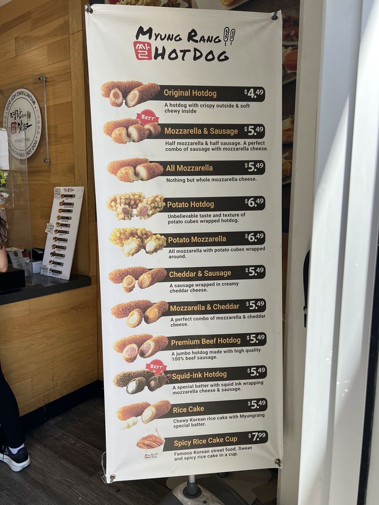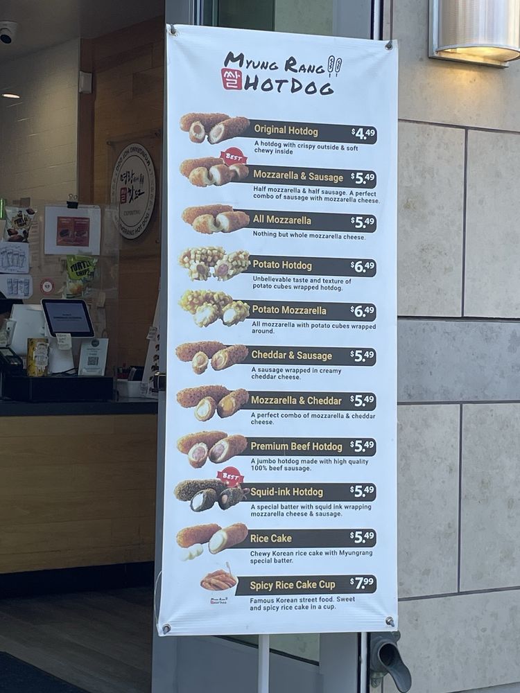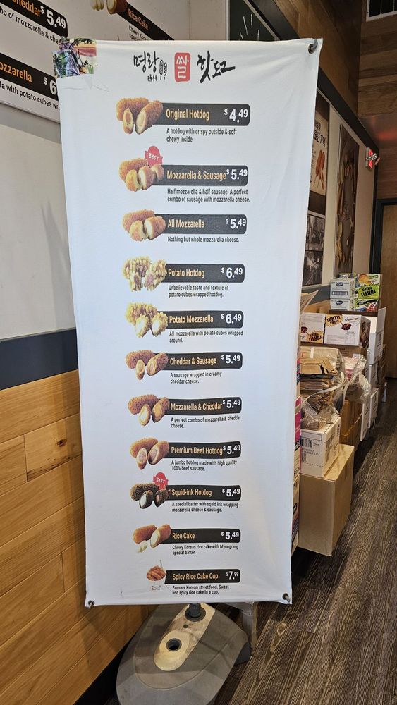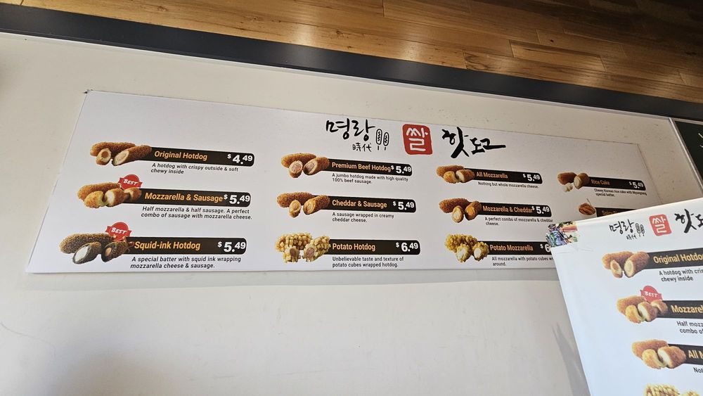 Myungrang Hot Dog in Cupertino offers a unique Korean twist on classic hot dogs. This casual and trendy spot is perfect for lunch or grabbing a quick snack. The menu features a variety of hot dog options such as Cheddar & Sausage, Potato Mozzarella, Mozzarella & Cheddar, and Squid Ink Hot Dog. Customers rave about the crispy outer layer and flavorful fillings. The hot dogs are customizable with different toppings like hot Cheetos, spicy mayo, and flaming hot Cheeto. The combination of sugar in the batter adds a unique touch to the hot dogs. With fast service and outdoor seating available, Myungrang Hot Dog is a popular choice for those looking for a delicious and satisfying meal on the go.